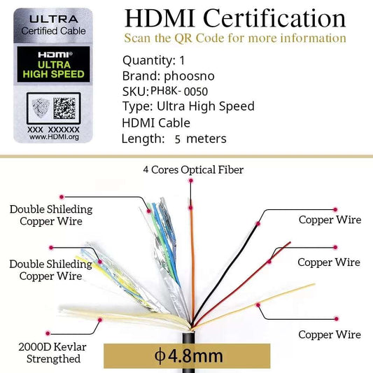 Das Phoossno HDMI 8K-Kabel ist ein HDMI-zertifiziertes Ultra-High-Speed-HDMI-Kabel mit einer Länge von 5 m, 7,5 m, 10 m, 15 m und 20 m und unterstützt 48 Gbit/s. Diese Zertifizierung stellt sicher, dass dieses Kabel 1080p bis 4K@60Hz, 4K@120Hz und 8K@60Hz unterstützt, außerdem 5K- und 10K-Auflösungen für PC-Displays unterstützt und HDR, VRR, eARC und alle anderen HDMI 2.1-Funktionen unterstützt. Das aktive optische Kabel Phoossno HDMI 8K weist folgende Unterschiede auf: 1. Integrierter aktiver Glasfaser-Motor für Hochgeschwindigkeitssignalübertragung mit 48 Gbps. 2. Das Kabel ist unidirektional, die Quelle wird an PC/DVD angeschlossen, das Display an TV/Projektor usw. 3. Hochwertige Tests und Verifizierungen, einschließlich: a> 10.000 Biegetests, b> 5.000-maliger Test des Steckers zum Ein- und Ausstecken, c> 500 Stunden Funktionstest bei -20 °C und +50 °C, d> Verstärkte Kevlar-Konstruktion unterstützt maximale Zugkraft von 20 kg
